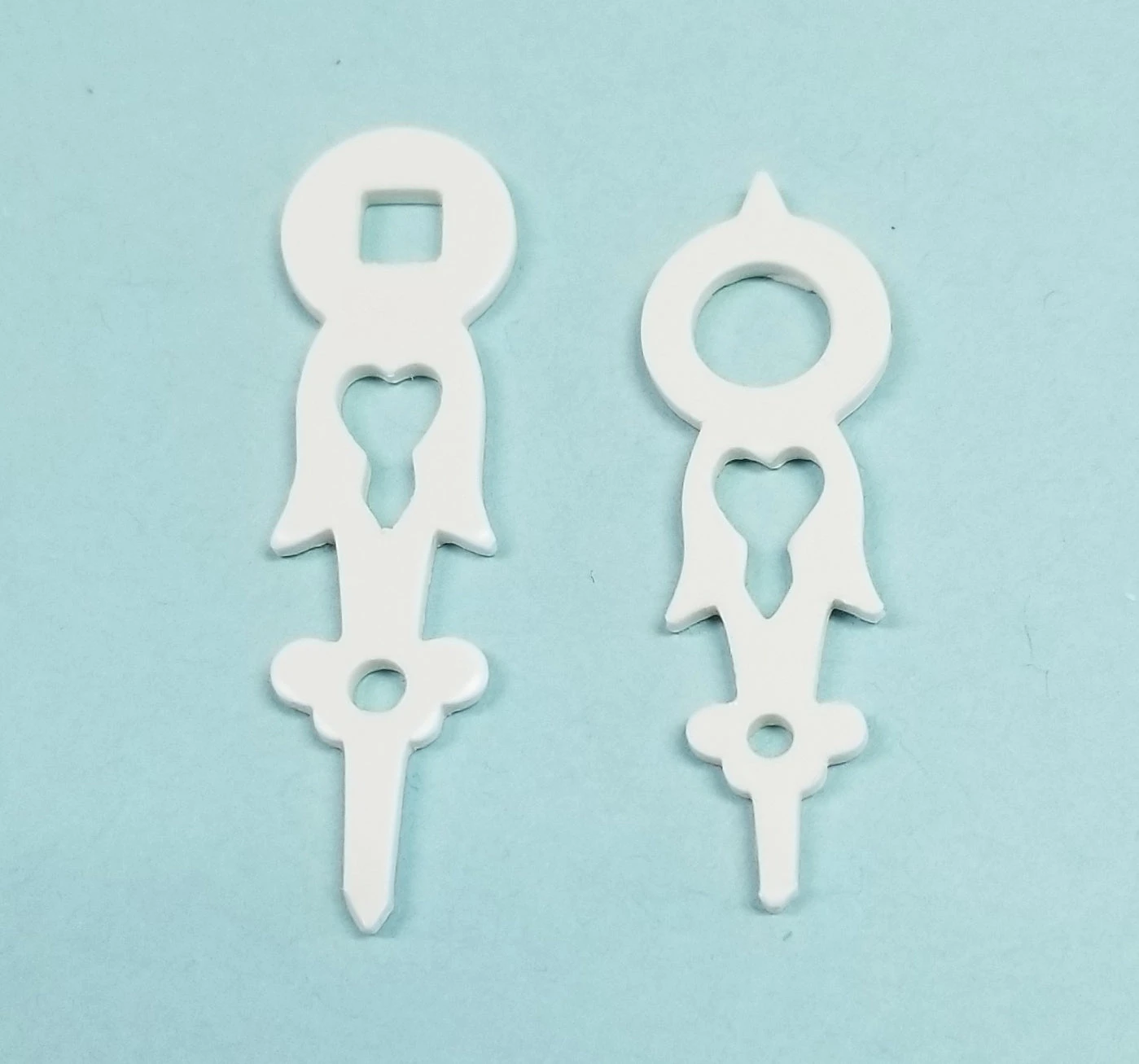 AHS07 Fits 7cm dial. Minute hand length is approximately 1.2″ to 1-3/8″. White Plastic. Sold in pairs. 4mm square hole on minute hand. Minute hand length is measured from the center of the hole to the tip of the hand.