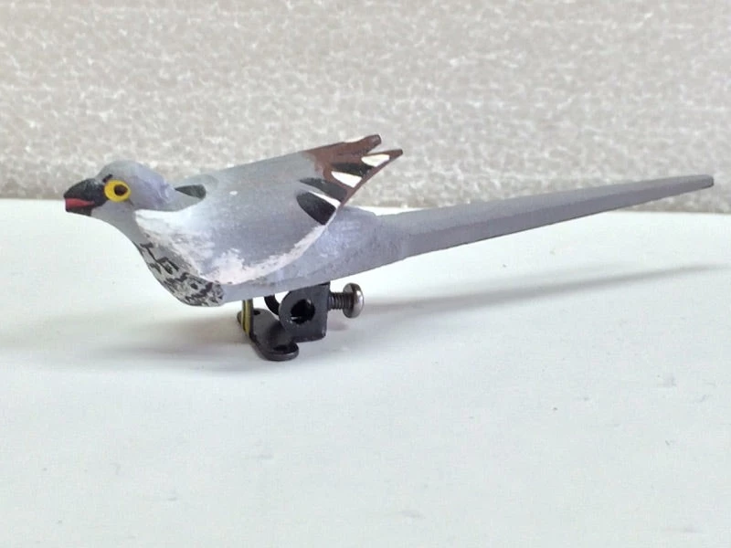 Painted wooden cuckoo bird with metal base and carved extended wings.