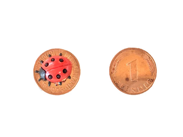 Ladybug attached to the top of a German Pfennig. The pfennig was the German penny before they joined the European Union, and now use the Euro. Germans believe both ladybugs and pennies are symbols of good luck.