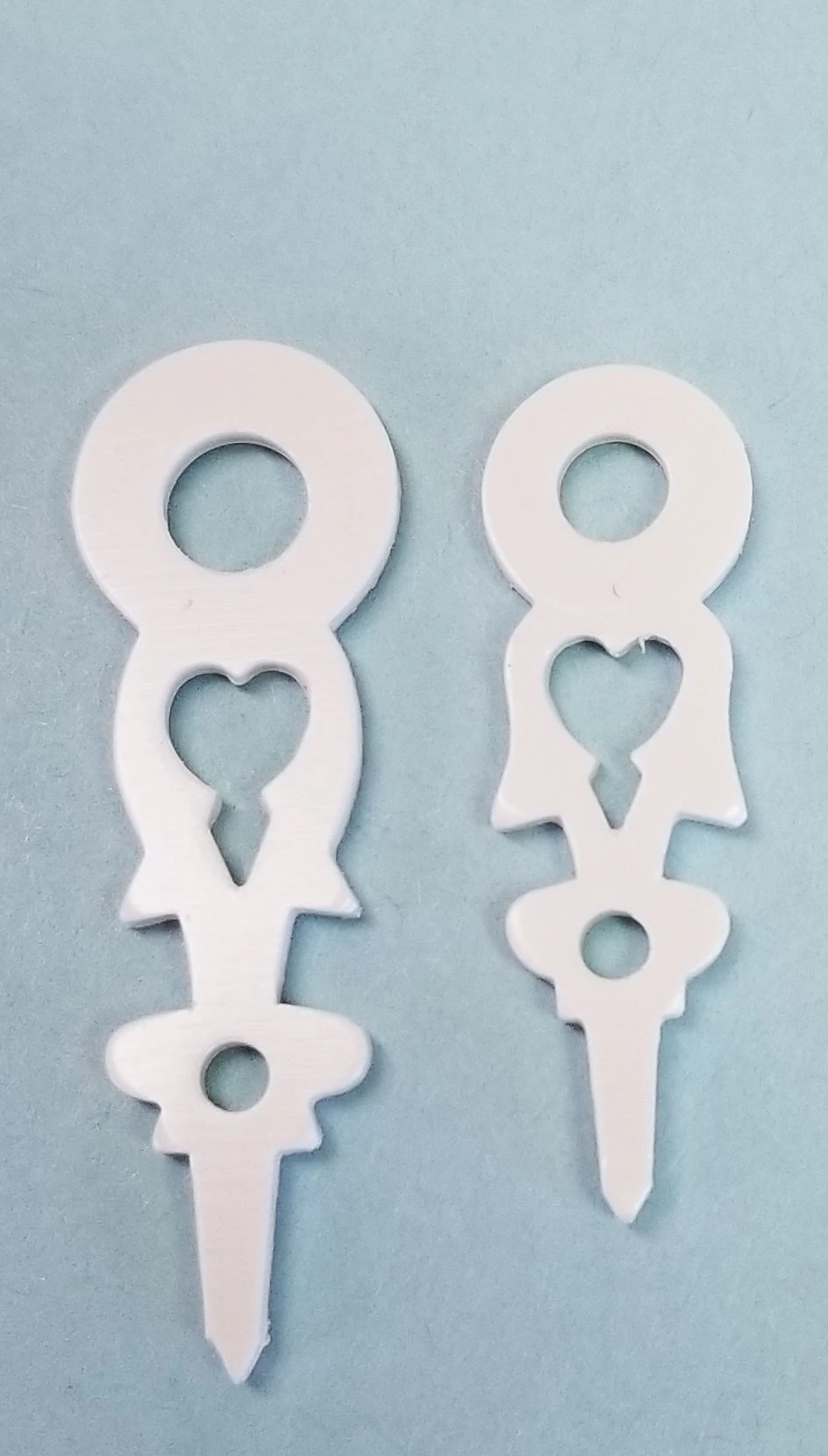 AH07 Fits 8cm dial. Minute hand length is approximately 1.25″ to 1 3/8″. White Plastic. Sold in pairs. Minute hand length is measured from the center of the hole to the tip of the hand.