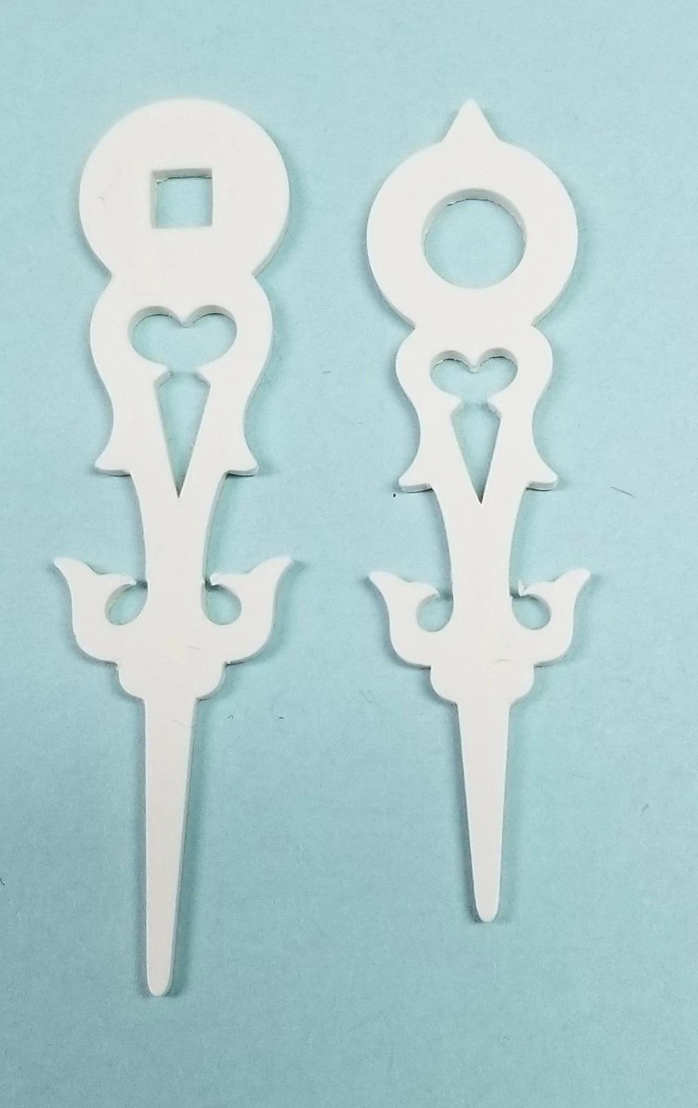 Fits 10cm to 11cm dials (can be shortened). Minute hand length is approximately 1-7/8″ to 2″. White Plastic. Sold in pairs. 4mm square hole on minute hand.