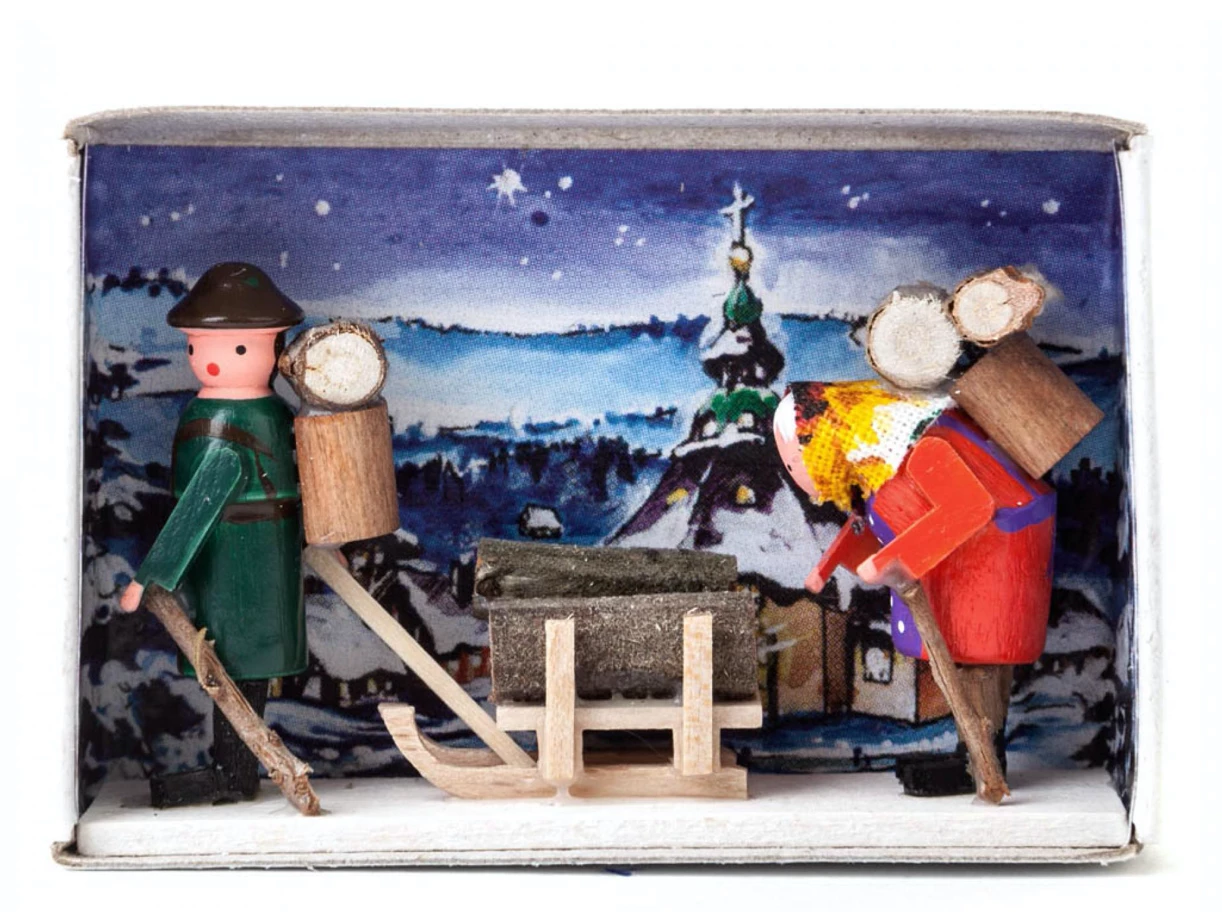 These popular miniatures in the Matchbox are made in Seiffen since 1920. Earlier, the matchbox was intended more as a packaging for the miniatures. Later, furnishings and figures were placed in the boxes themselves.Â