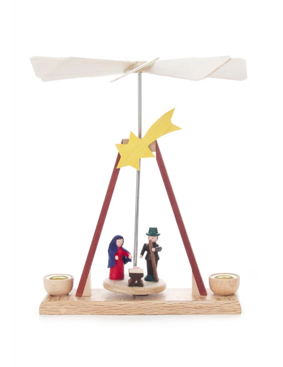 Authentic Wooden German Pyramid. This pyramid features one platform with four candle holders. When the candles are lit, the scene on the pyramid will begin to move as the heat from the candles begins to rise. Requires 2 – 10mm Candles – Not Included.