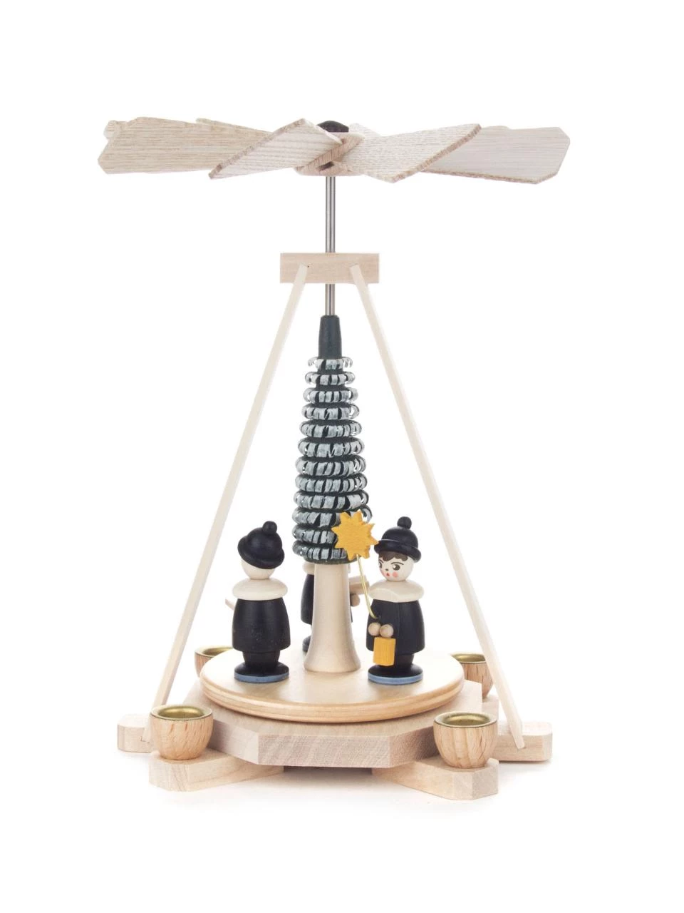 Authentic Wooden German Pyramid. This pyramid features one platform with four candle holders. When the candles are lit, the scene on the pyramid will begin to move as the heat from the candles begins to rise. Requires 4 – 10mm Candles – Not Included.