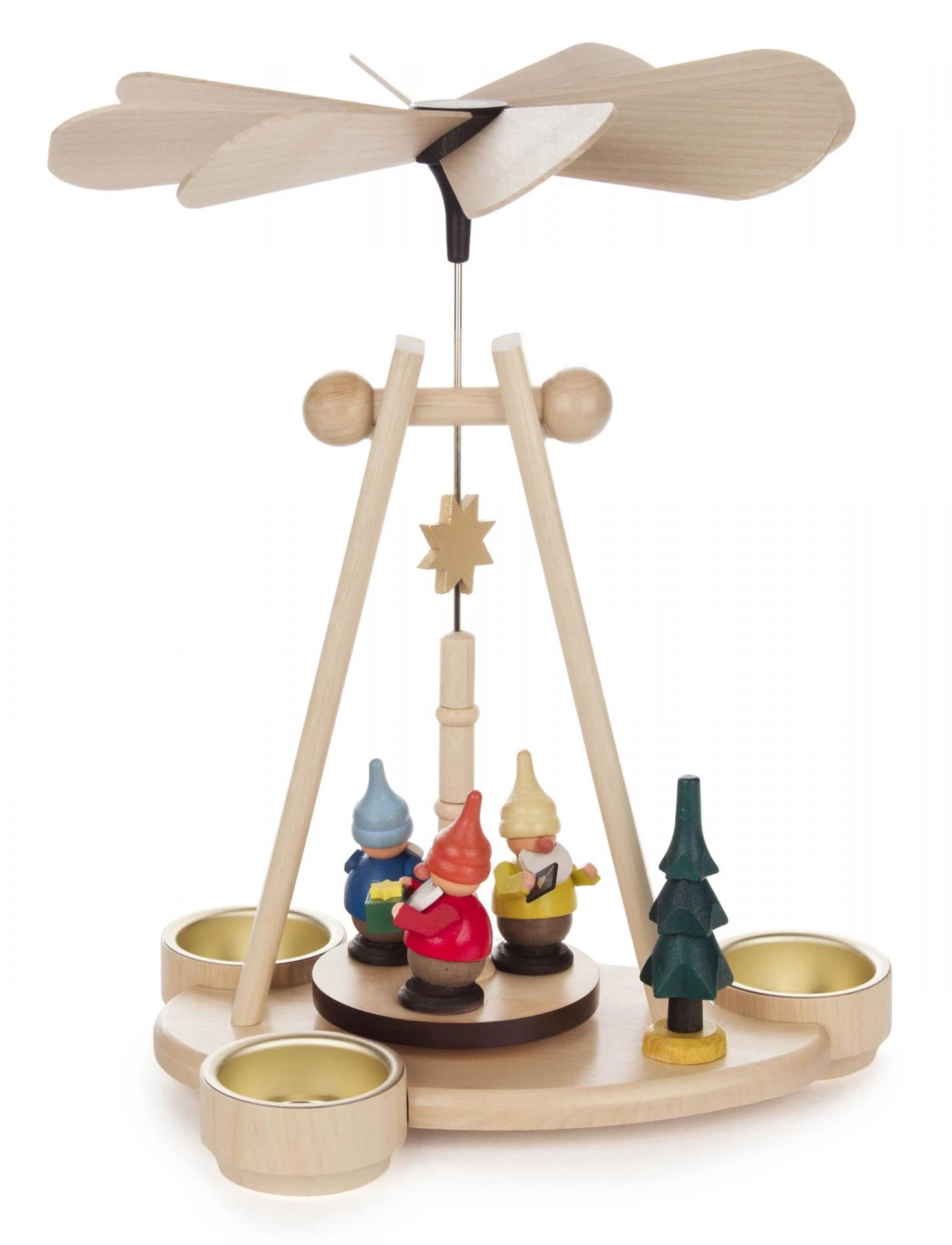 Authentic Wooden German Pyramid. This pyramid features one platform with four candle holders. When the candles are lit, the scene on the pyramid will begin to move as the heat from the candles begins to rise. Requires 4 – tealight candles – Not Included.