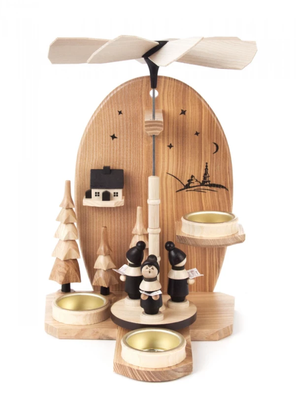 Authentic Wooden German Pyramid. This pyramid features one platform with four candle holders. When the candles are lit, the scene on the pyramid will begin to move as the heat from the candles begins to rise. Requires 3 – tealight candles – Not Included.