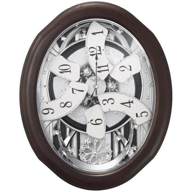 Every hour on the hour the face splits into 6 parts to reveal silver-finished instruments and music notes while playing one of 12 Americana, 12 Classic, or 6 Christmas melodies. Pendulum rotates continuously. Wooden Case. Auto Night Shut Off.