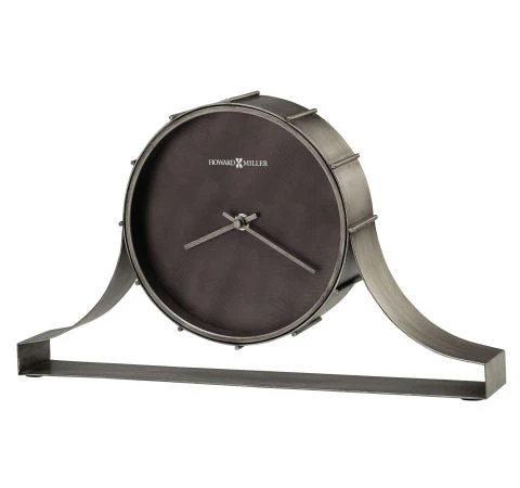 This striking, industrial metal mantel clock features a bent iron tambour frame with an aged silver finish. Blackened, machined steel dial with contrasting aged silver-finished hour and minute hands. Felt pads protect your mantel or tabletop. Quartz, battery-operated movement requires one AA sized battery.