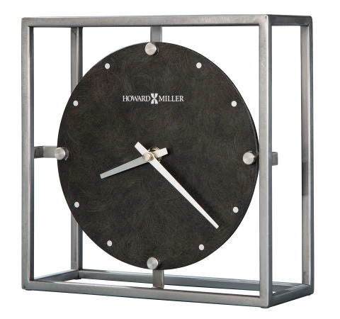 Simple, geometric lines and shapes in monochrome tones are the stars of this contemporary mantel clock. The square, metal, open-frame of this clock features an aged nickel finish with grind marks and distressing. Dial features a blackened steel finish with round, silver-tone hour markers and oversized, spun nickel-finished markers at the 12, 3, 6 and 9 positions and contrasting satin-silver-tone hour and minute hands. Rubber pads on the bottom of the frame protect your mantel or tabletop. Quartz, battery-operated movement requires one AA sized battery.