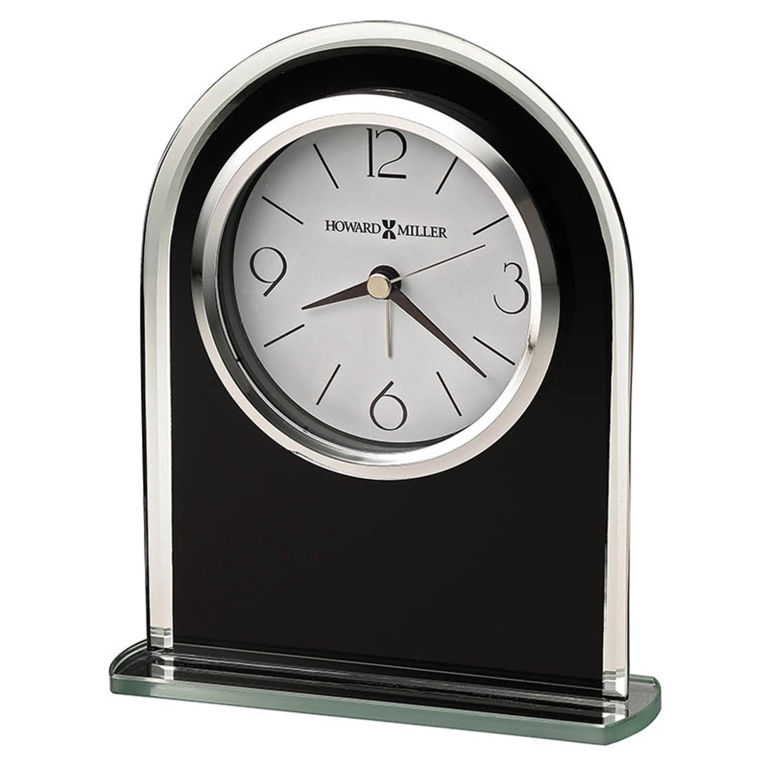 Black glass arched tabletop alarm clock with silver mirrored edge and base. White dial features black Arabic numerals at the 12, 3, 6, and 9 positions with black hour markers, beneath a glass crystal.Â