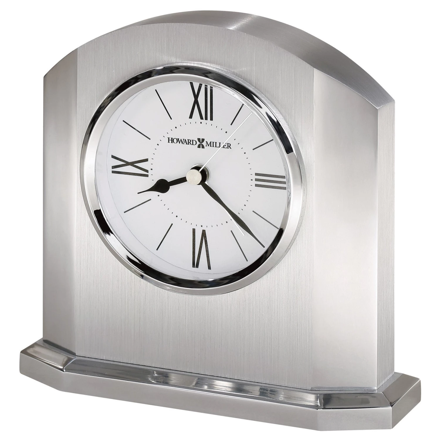 This handsome, silver-finished arched alarm clock features a solid aluminum case with polished beveled sides and a brushed aluminum base with beveled and polished sides and edges. White dial with contemporary black Roman numerals and hour markers; black hour and minute hands; silver second and alarm hands; and a glass crystal surrounded by a polished silver-tone bezel. A full felt bottom protects your desk or tabletop.