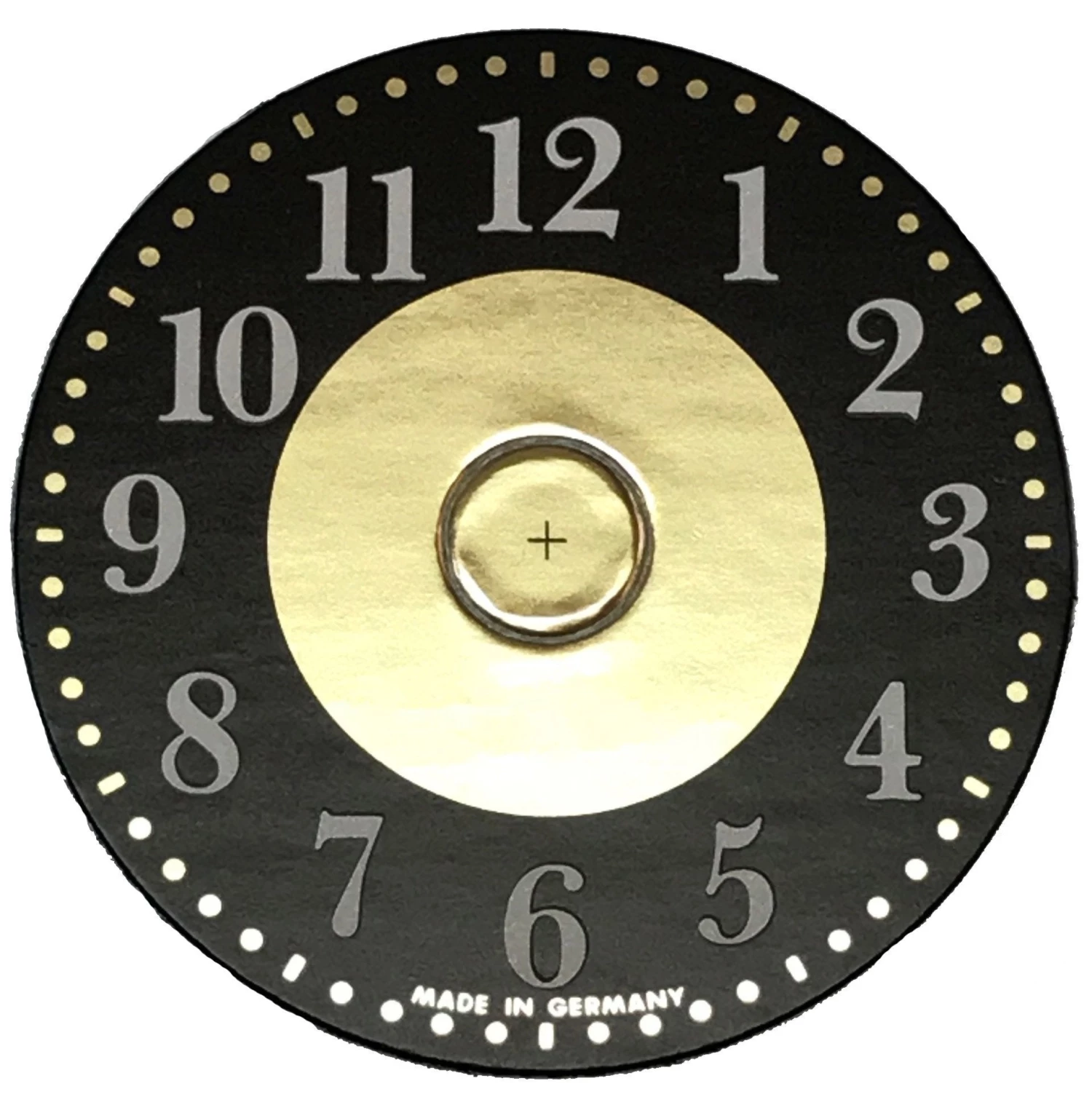 40mm or 1 1/2″ inch diameter paper dial. Foil front for quartz or 1 hole novelty German clocks.