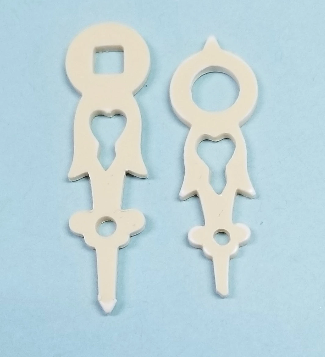 AHS07C Fits 7cm dial. Minute hand length is approximately 1.2″ to 1-3/8″. Cream Plastic. Sold in pairs. 4mm square hole on minute hand. Minute hand length is measured from the center of the hole to the tip of the hand.
