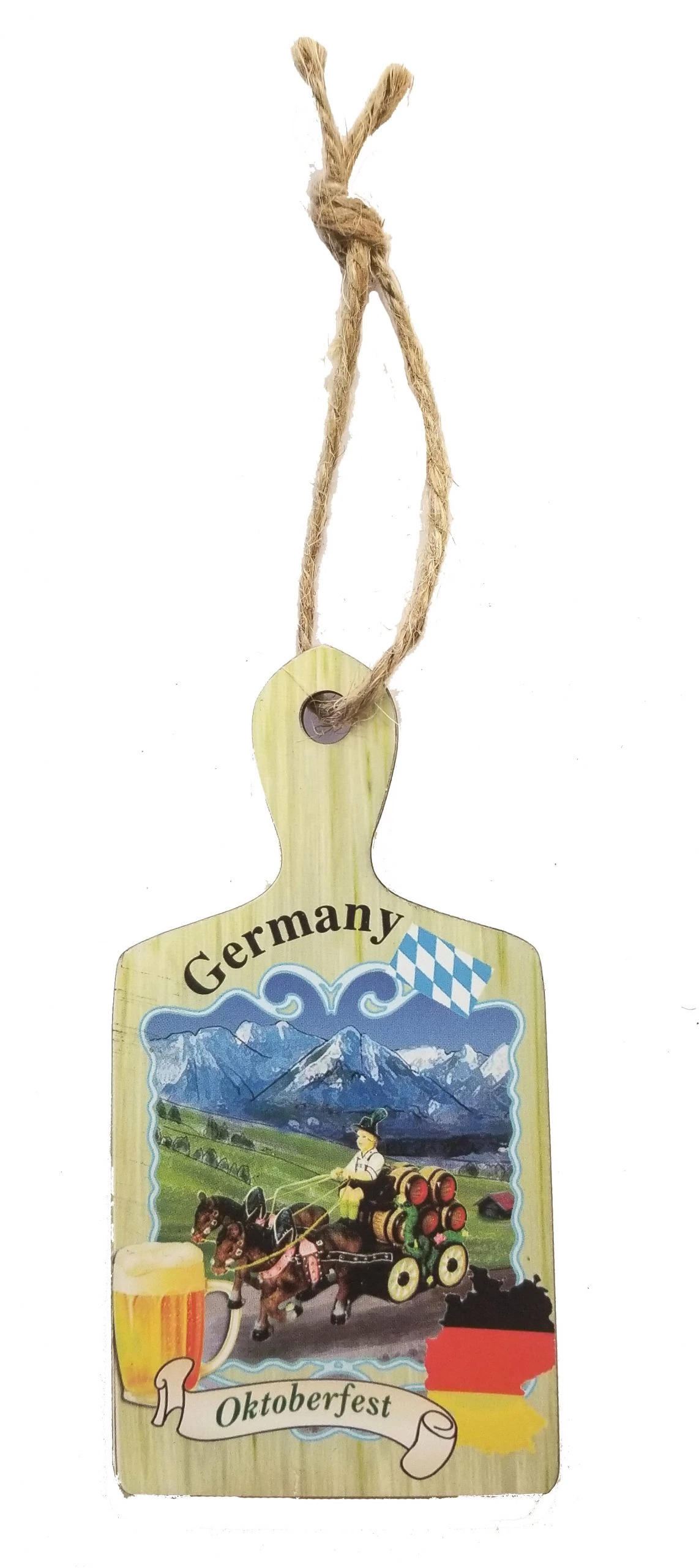 This wooden magnet is silk screened with a man with horse and carriage, and Oktoberfest Personalization.