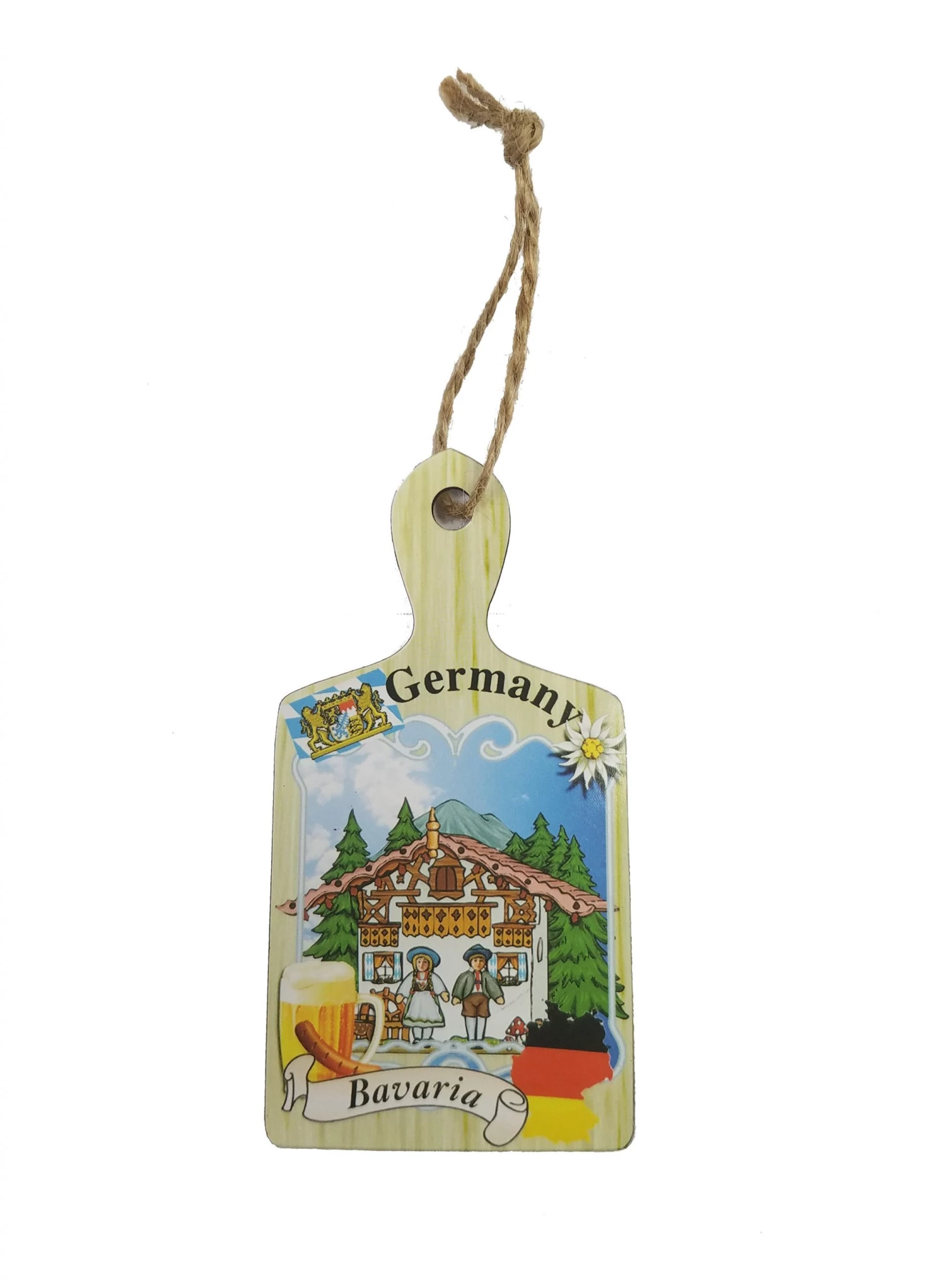 This wooden magnet is silk screened with a lions crest, a man and woman in front of a chalet and inscribed with Germany & Bavaria.