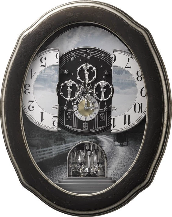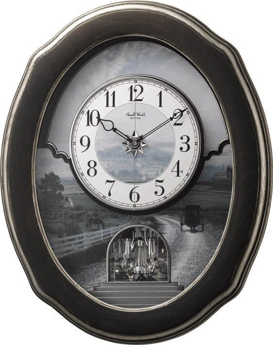 The Joyful Homestead II is state-of-the art creation comprised of 30 melodies. This clock features an all new song list, comprised of 12 Christian Hymns, 12 Classical Melodies & 6 Christmas favorites. On the hour, the dial splits into two and rotates 360 degrees while playing 1 of 30 melodies. The beautiful solid oak frame with Espresso Finish along with the Swarovski crystals and silver accents make this clock a truly elegant addition to any home.