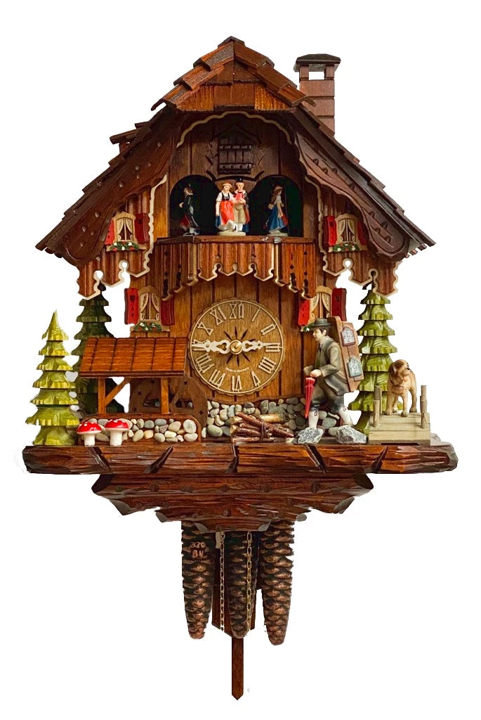 This hand crafted chalet will cuckoo the hour each hour, and once at half past. After the cuckoo, it will play 1 of 2 melodies: “Edelweiss” & “The Happy Wanderer” while the waterwheel turns, the dancers rotate and the peddler moves his arm up and down. Six feet of chain and three pine cone shaped cast weights will hang below the clock. Wooden hands, dial & bird.