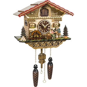 Cuckoos Hourly. After it cuckoos it will play one of 12 different melodies. Wooden dial with wooden roman numerals. Auto Night Shut Off. This clock has the option to turn the music off (but it will still cuckoo) or shut it completely off so it will only keep time.
