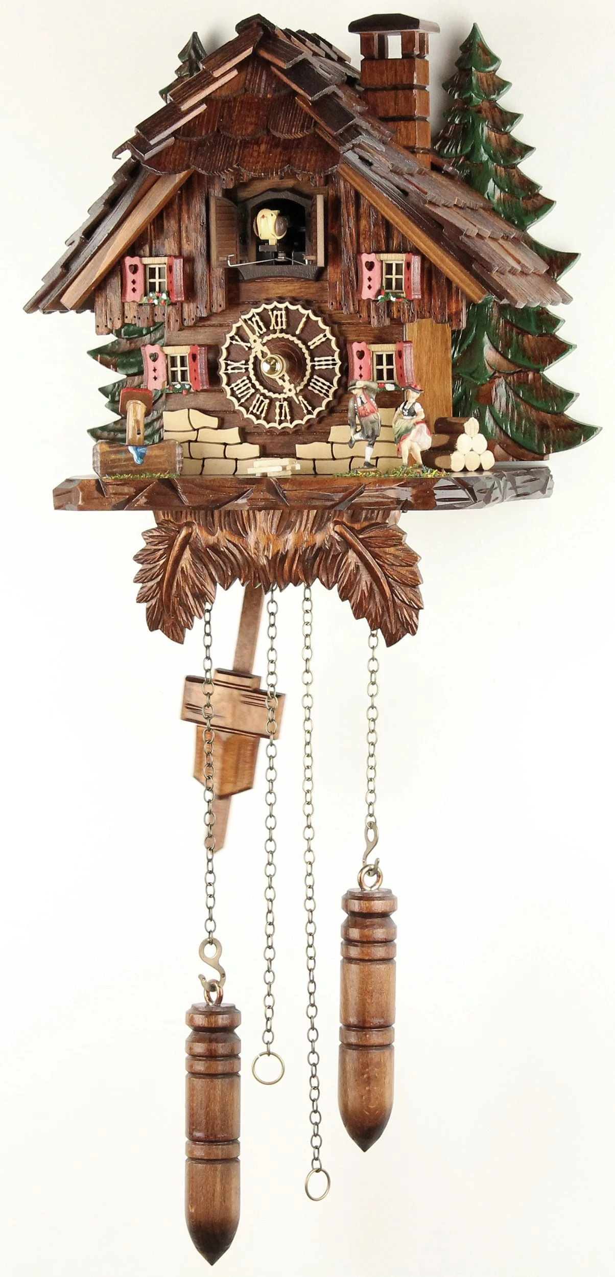 Clock will cuckoo the hour on each hour. After the cuckoo, it will play 1 of 12 melodies. Automatic Night Shut-Off feature turns the cuckoo & music off when the room becomes dark. Pendulum swings continuously behind 2 wood faux weights. Quartz, battery operated.