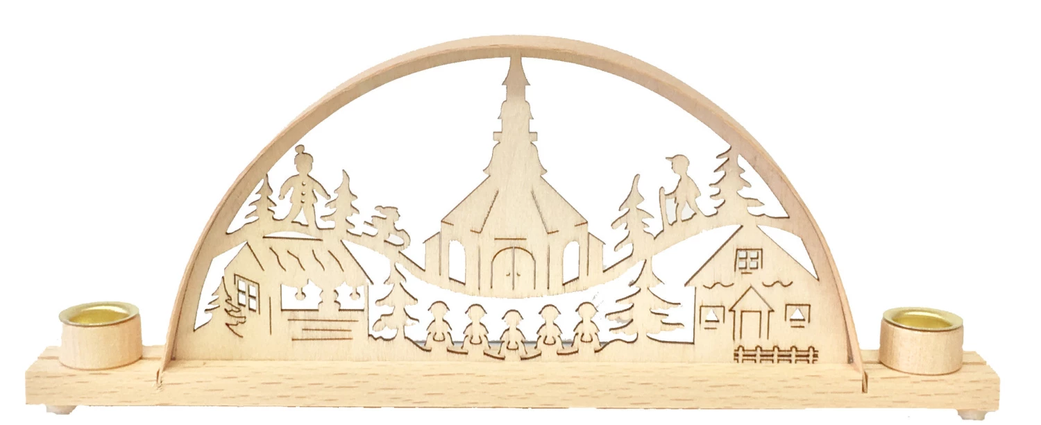 This wooden decoration holds two candles on the side of the arch, and also displays a village scene with carolers within the arch.
