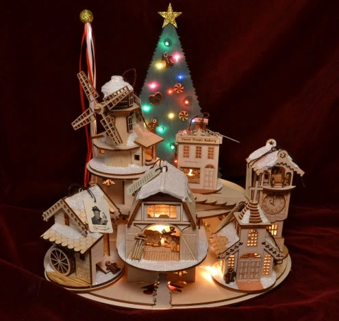 This display holds 6 ginger cottages (not included). It is lighted, including lights for the christmas tree. Select the individual Ginger Cottages you like, and place them on this display to make a beautiful christmas decoration.