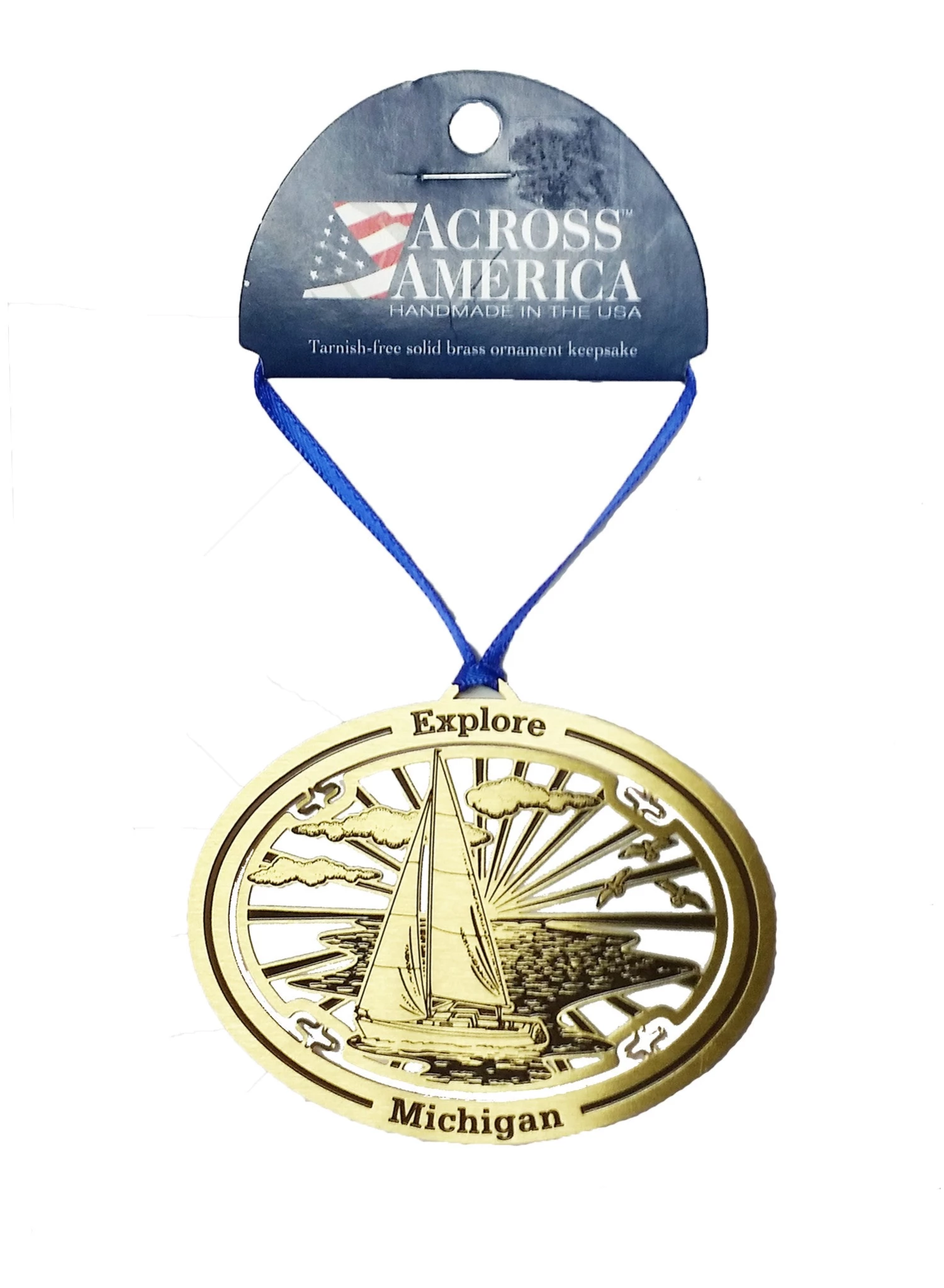 Brass Ornament with a Sail boat personalized with Explore Michigan.