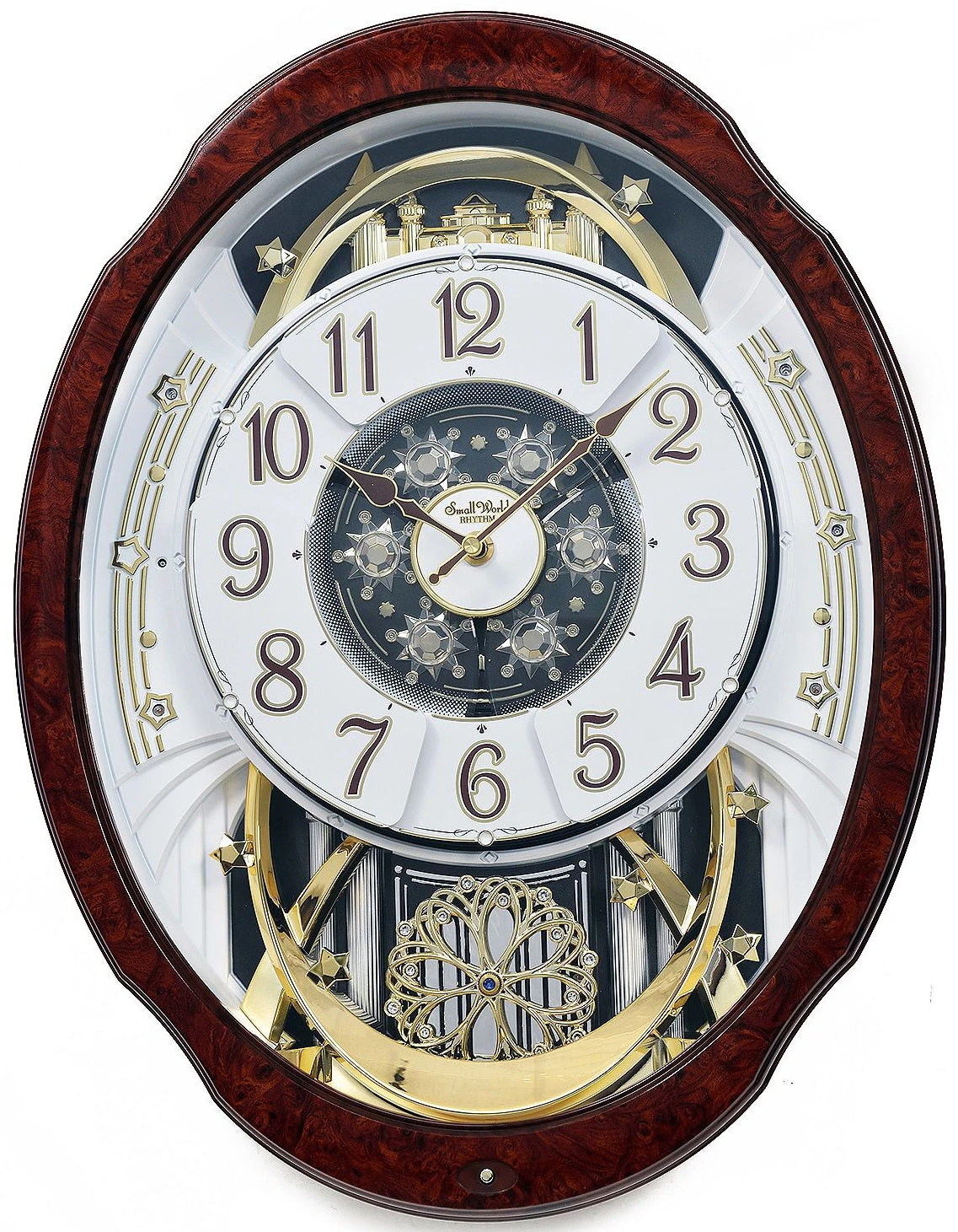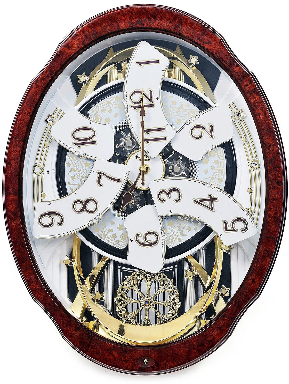 This Woodgrain Marvelous gets its name from the beautiful faux burl wood frame. On the hour, the dial opens into 6 sections revealing instruments and music notes that rotate to one of the 30 melodies all while LED lights flash to the melody. The flower-shaped wheel at the bottom of the clock steadily rotates and is embellished with 17 Swarovski crystals. Clock is battery quartz operated. Batteries Included.