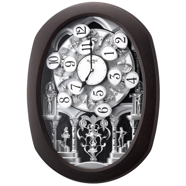 This model is in a class of it’s own. The eye-catching features fascinate with the architectural structure of this theme. At the top of the hour, the numbers rotate in six couples to reveal a swan and dance theme. The swinging pendulum with Swarovski crystals on this model keeps the clock in motion. It rotates through 1 of 30 melodies that will have you wanting “encore”.