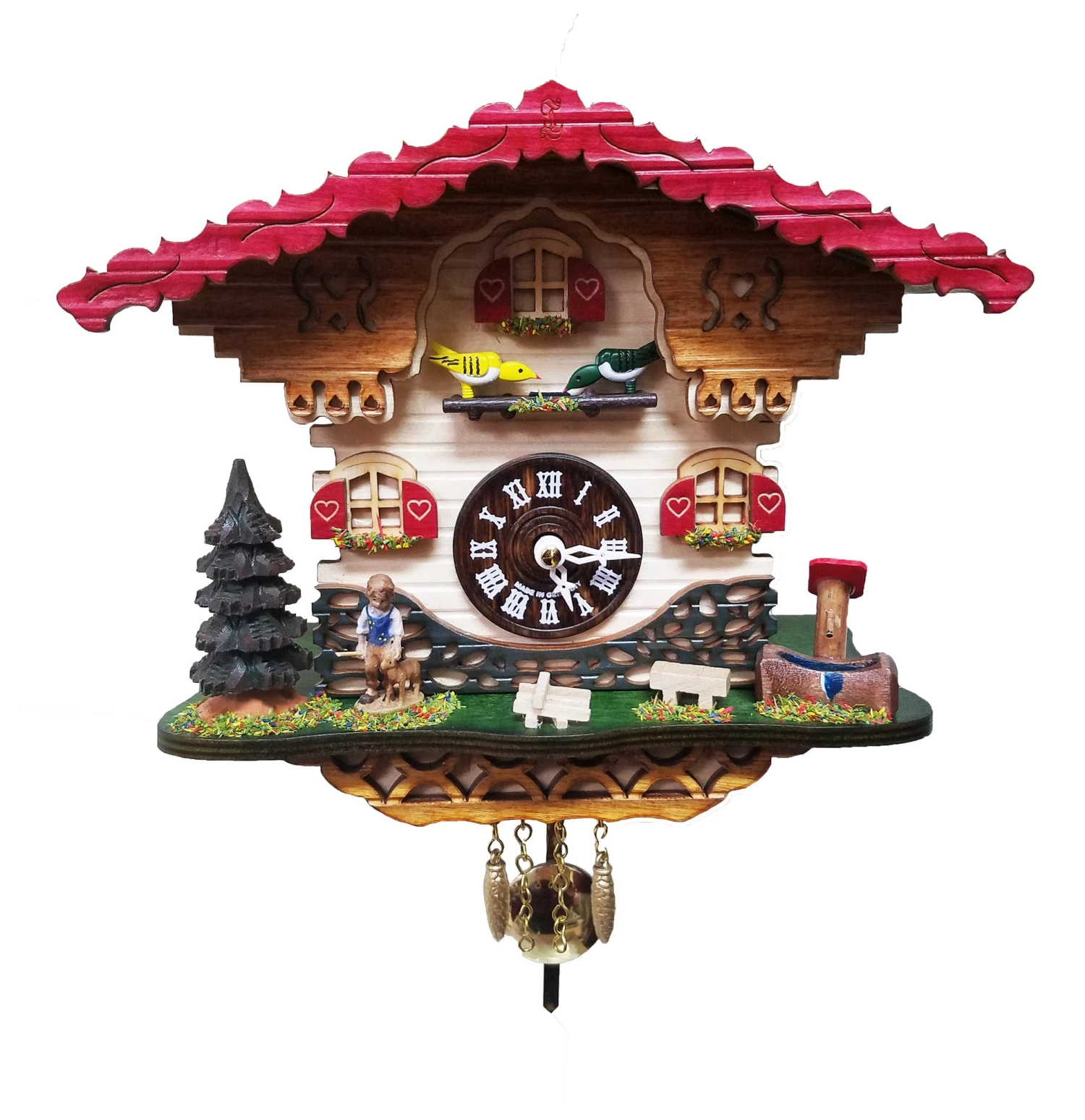 This novelty cuckoo clock will cuckoo the hour each hour or play 1 of 12 melodies. Pendulum swings continuously while the birds move up and down. On-Off Switch. Quartz, Battery Operated. Requires 2 – AA Batteries, Included.