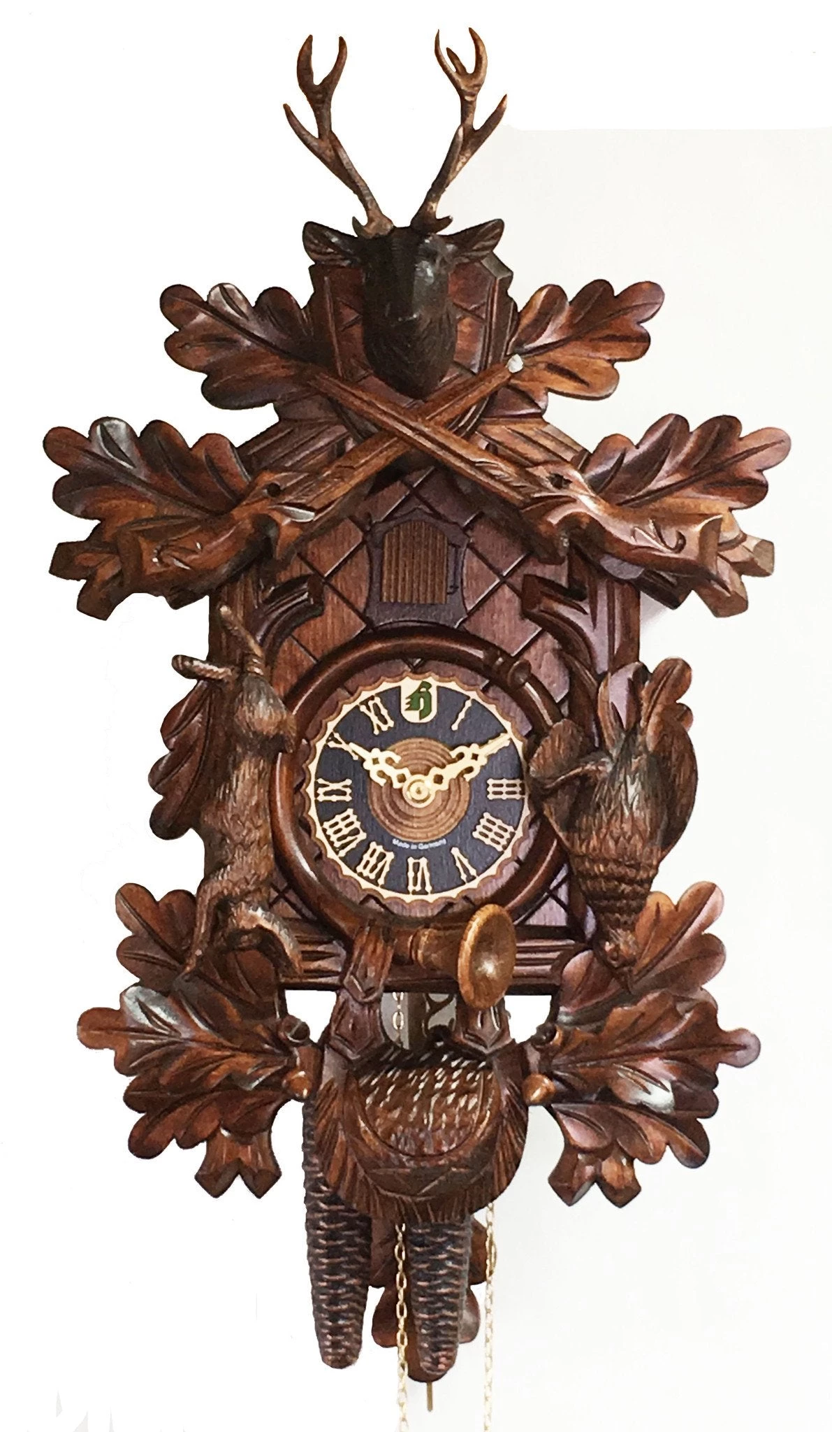 Trophy Style with a rabbit & a pheasant hanging upside down. Top piece has a deer head with wooden antlers & crossing guns. Wooden dial, hands, and cuckoo bird. Clock cuckoos the hour each hour and once on the half hour. Six feet of chain will hang below clock with two pine cone shaped cast weights. Night shut off lever. Wooden Case. Walnut Stain.