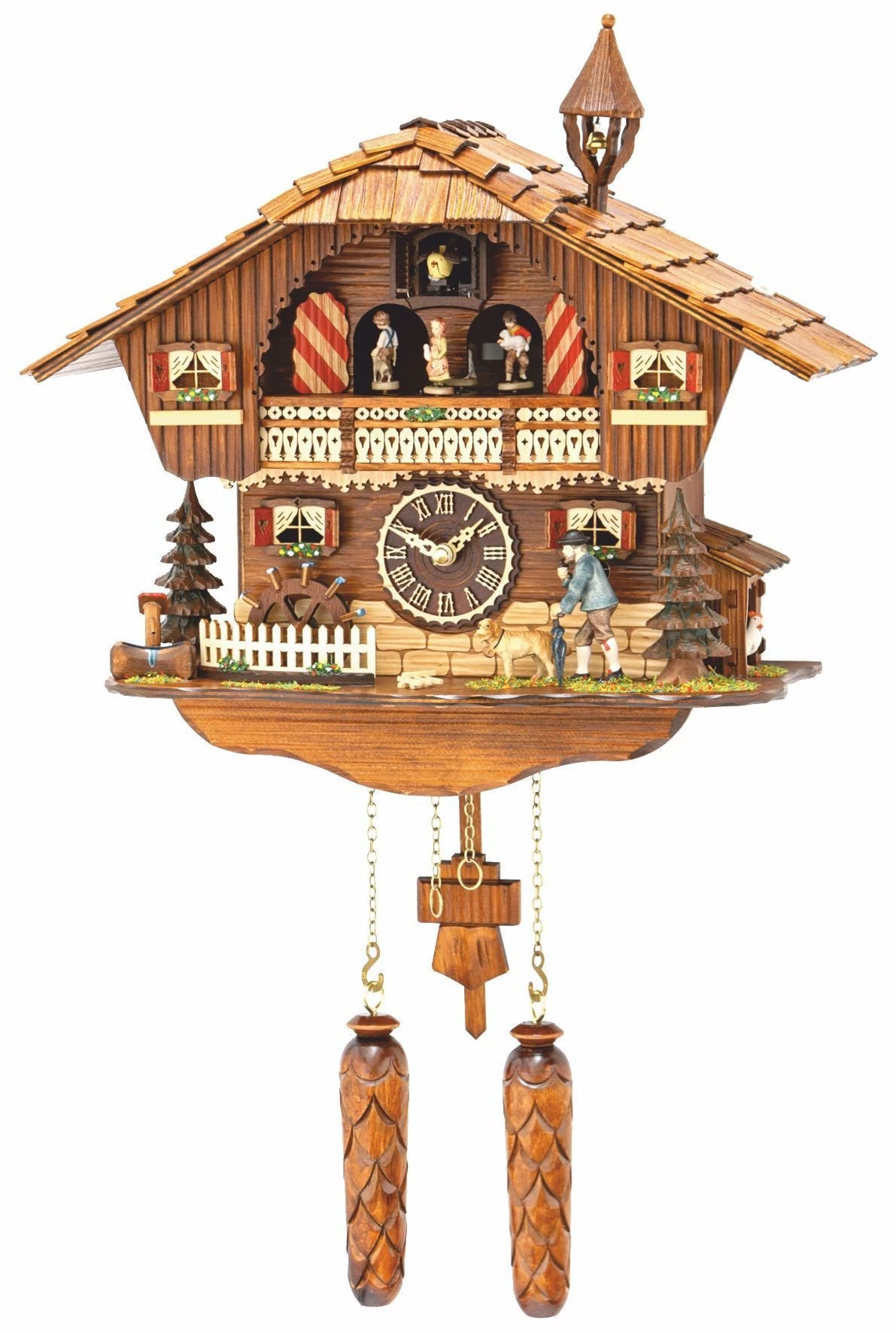 This cuckoo clock will cuckoo the hour each hour. After the bird cuckoos, 1 of 12 melodies will play. While the melodies play, the wanderer lifts and lowers his umbrella, the water wheel turns while the dancers turn around the balcony. Auto Night Shut-Off.