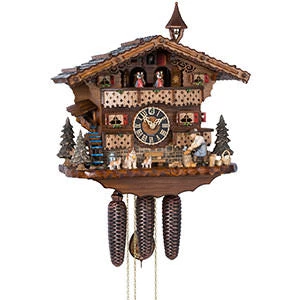 This Black Forest cuckoo clock will cuckoo the hour each hour, and once at half past.. After it cuckoos the full hour it will play one of two melodies (“Edelweiss” & “The Happy Wanderer”) while the dancers rotate around the balcony, the woodchopper will chop his wood, and the waterwheel will turn. Six feet of chain will hang below the clock with three pine cone shaped cast weights. Wooden dial, hands, and cuckoo bird. Walnut Stain with Hand Painted Accents. Night Shut-Off Lever with Automatic Night-Off Option.