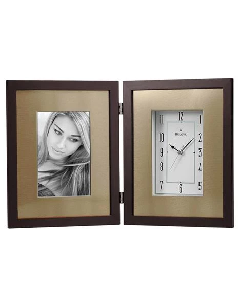 Hinged wood case with espresso brown finish. 4″ x 6″ photograph opening. Brushed pewter finish Aluminum inner frame. White dial with black hands and numerals. Protective glass lens. Quartz movement that requires one AA Battery(included).